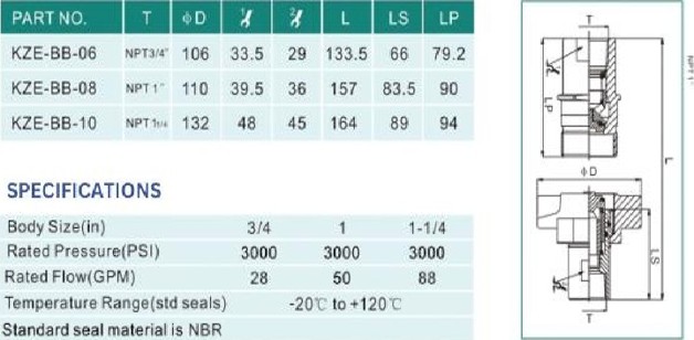 KZE-BB series is a thread to connect.It can be widely used in various application to be connected under pressure and less spillage.KZE-BB can be suitable used in connecting equipment of the hydraulic lines like power tongs swivel and mobile drillings.it also used dump tracks and dump trailer to connect with to wet-line hydraulic system.it is also used in submersible pumps . engine test stands and the equipment under high pressure or high liquid transfer.